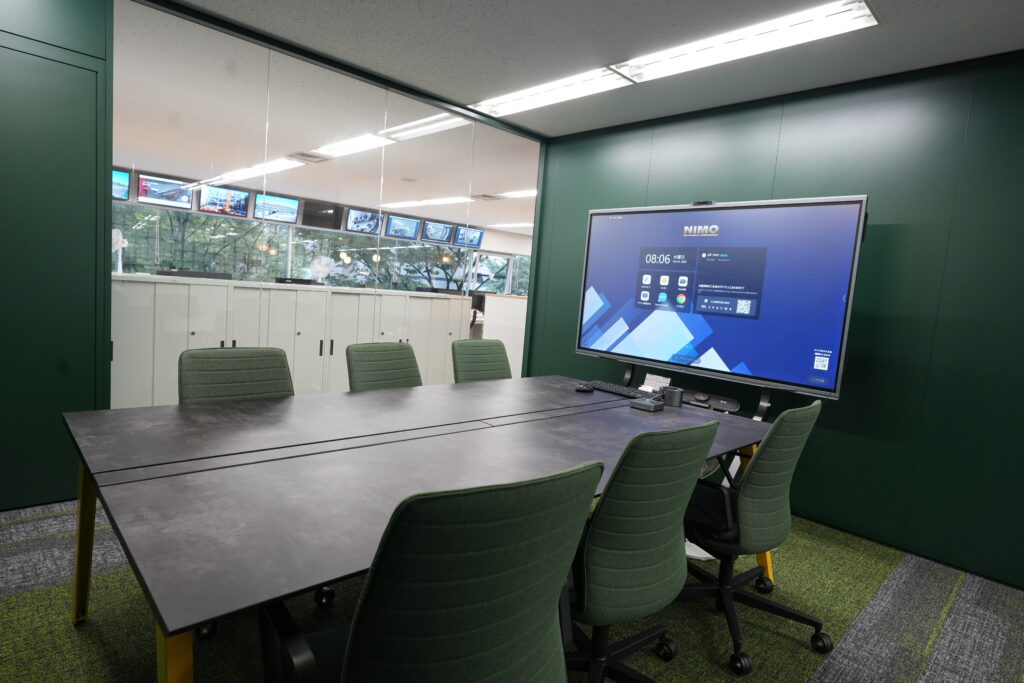 会議・応接室は、あえて事務所の真ん中に配置し、ガラス張りにすることで