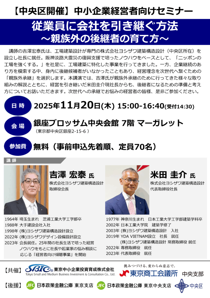YOSHIZAWA group 吉澤会長と米田社長が登壇・講師を務めました、中小企業投資育成 経営者セミナーの実施報告です。